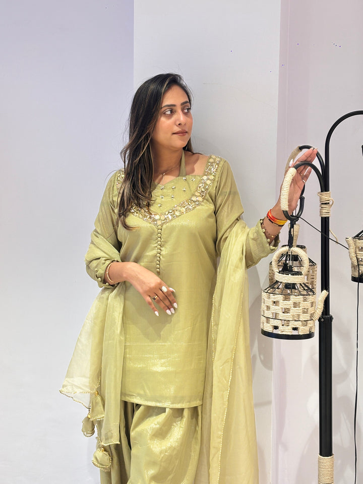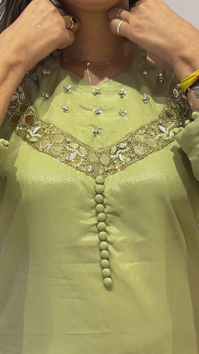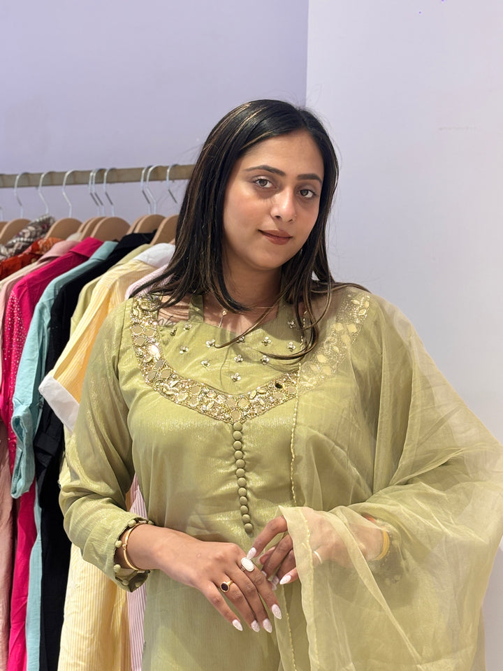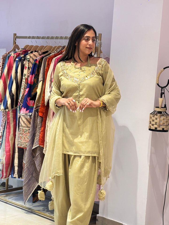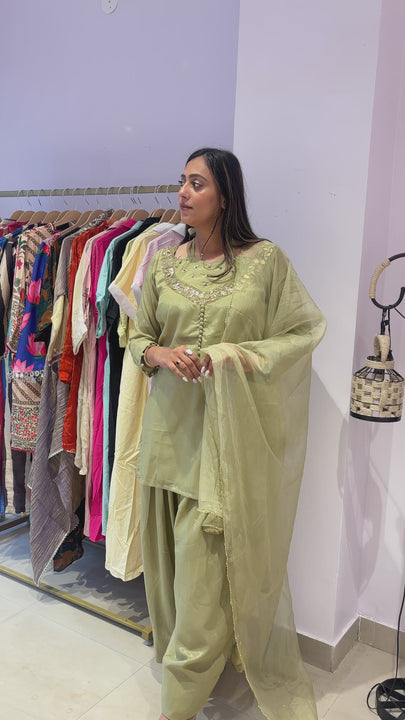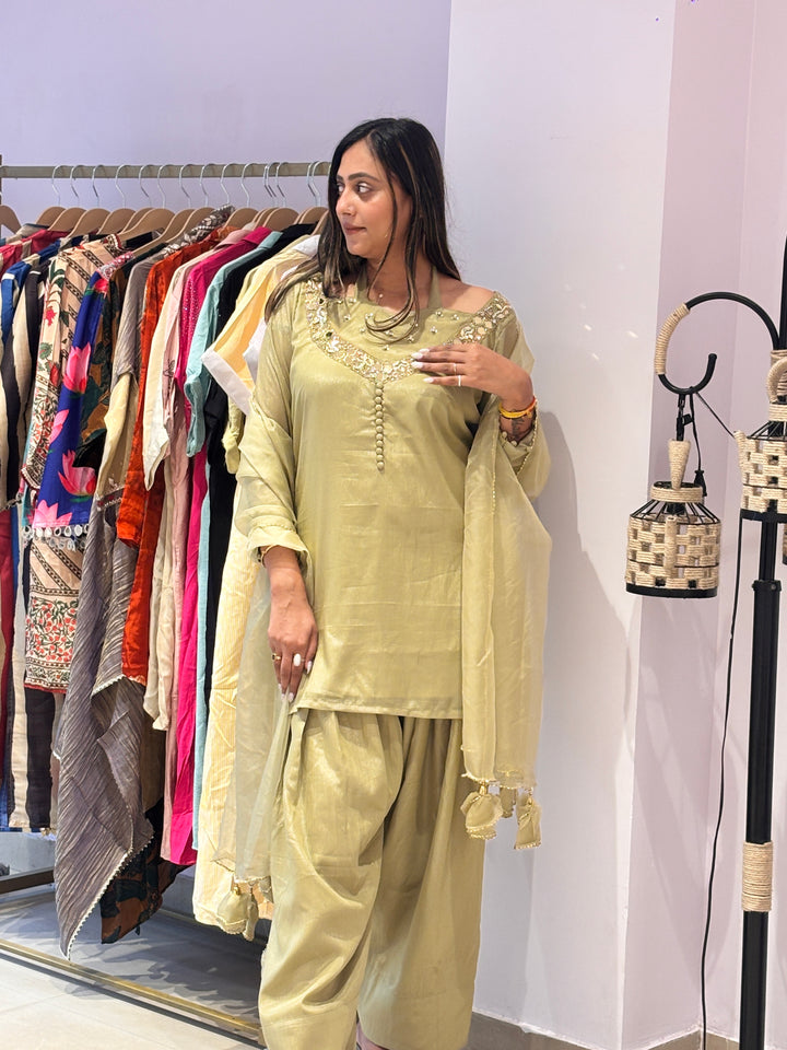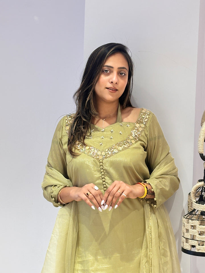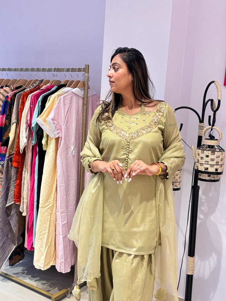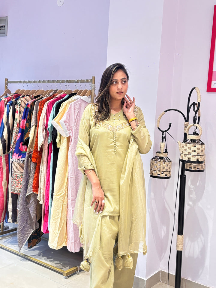 Graceful beige kurta set adorned with vibrant red and green floral prints. The kurta features a detailed neckline design and comes with a matching printed dupatta. Ideal for casual outings, festive gatherings, and ethnic occasions.