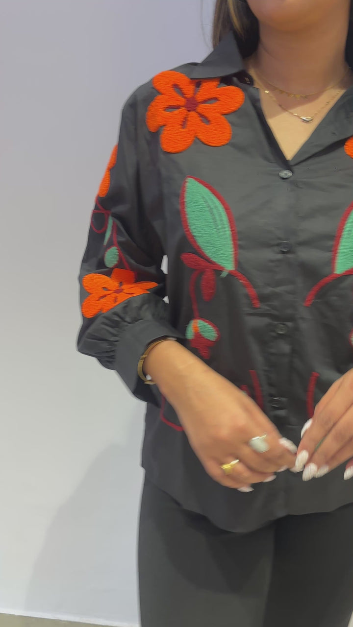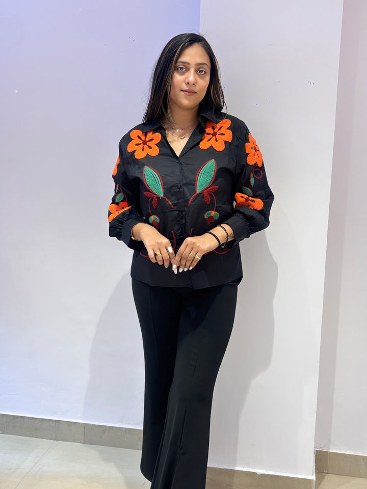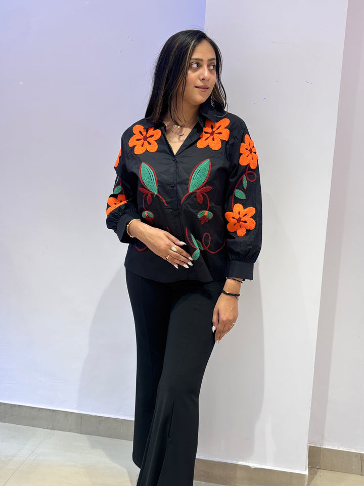Classic black shirt top adorned with bright orange floral embroidery and leafy accents, perfect for a chic yet bold look.