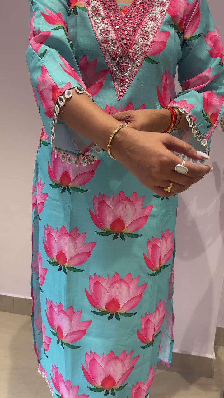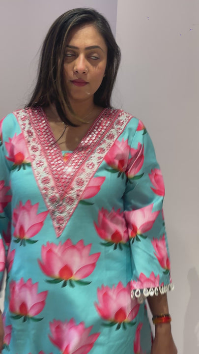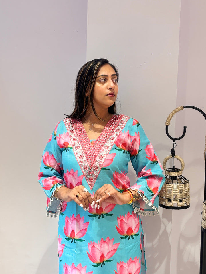 Bright blue kurta with bold pink lotus floral prints and intricate embroidery around the neckline. Features delicate mirror work with lace detail on sleeves. A chic and stylish ethnic wear option for festive gatherings, casual outings, and special occasions.
