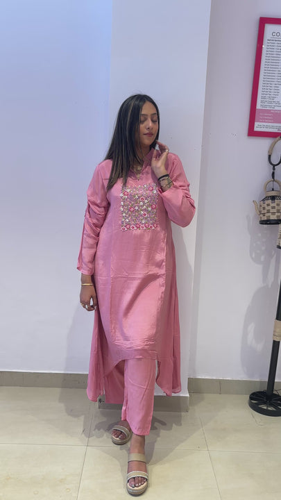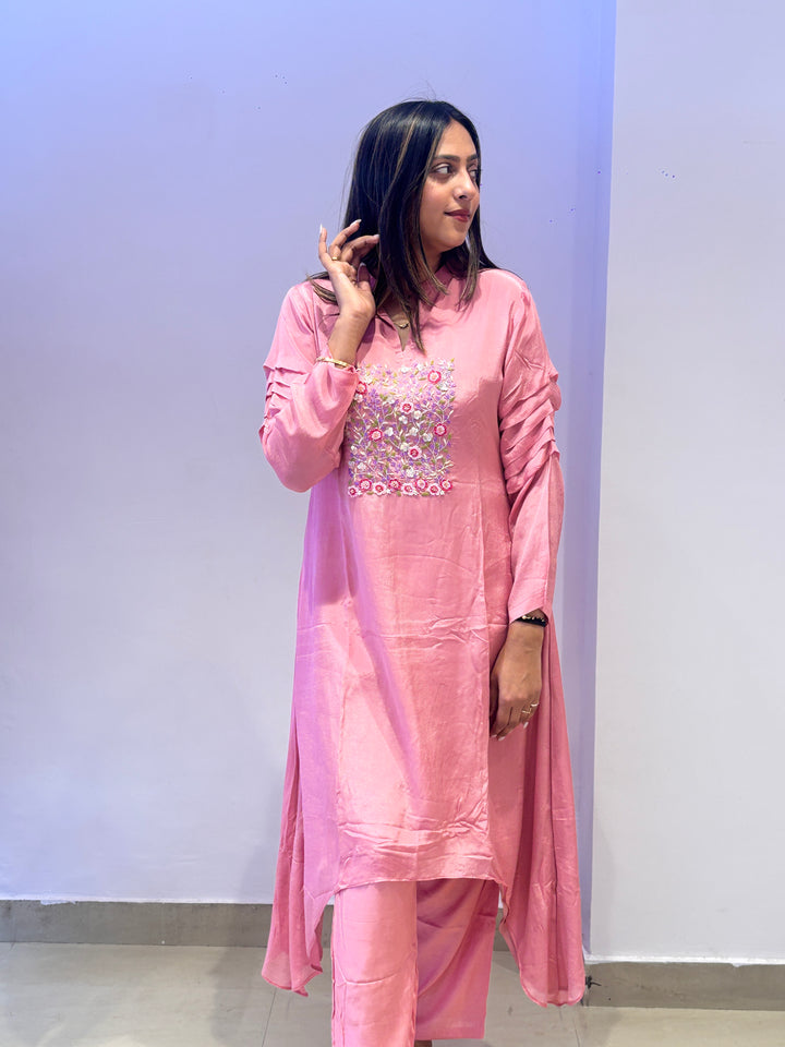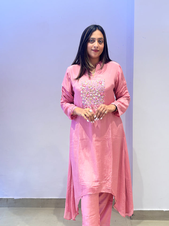 Elegant Pink kurta set with detailed floral embroidery on the front. Comes with matching pants—ideal for festive wear or traditional occasions.
