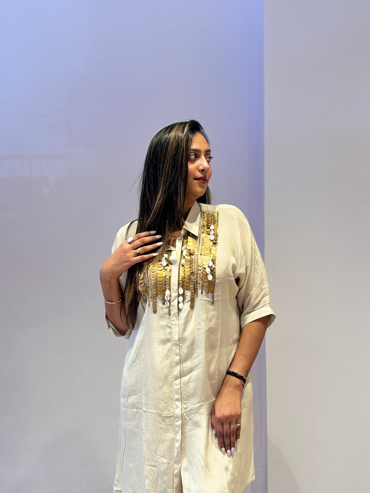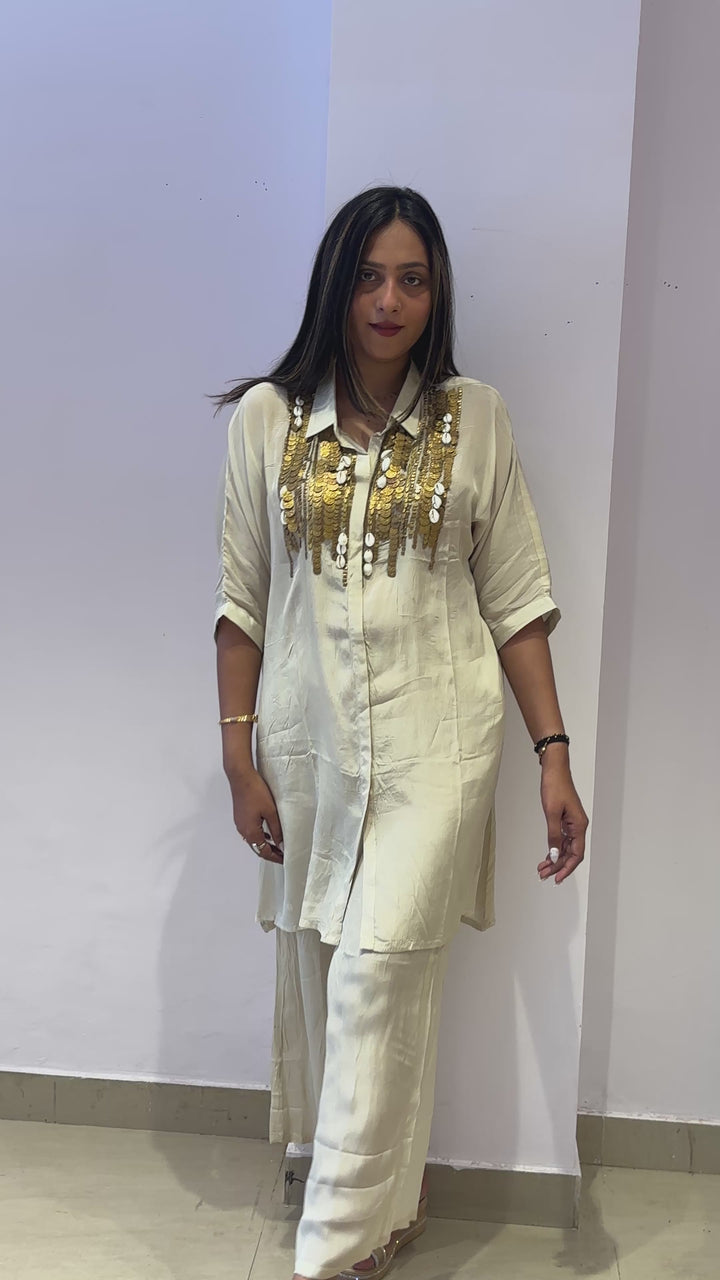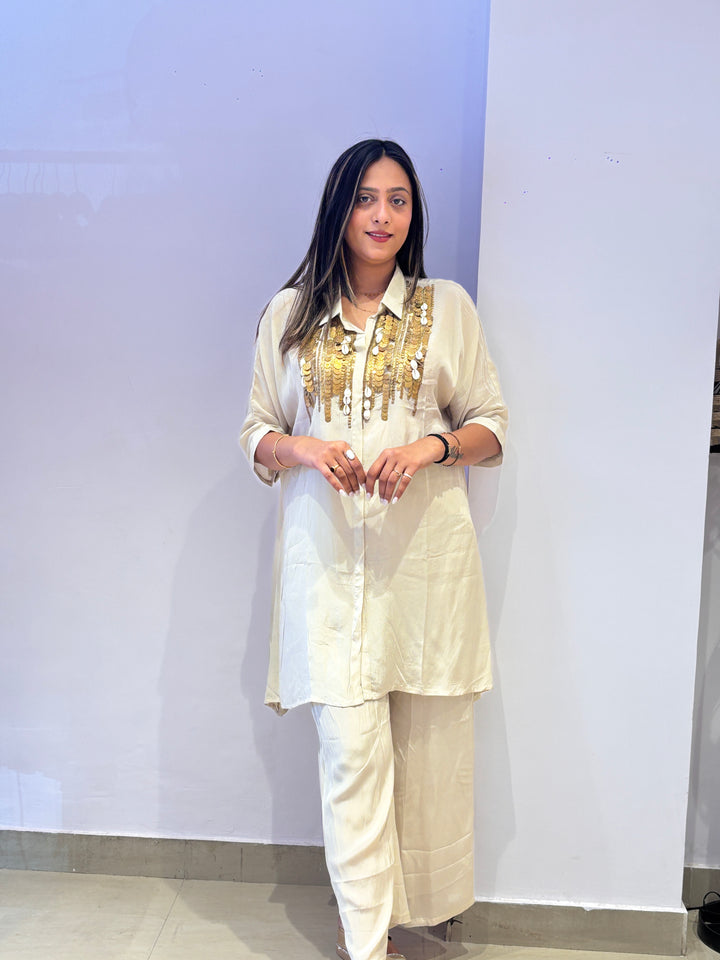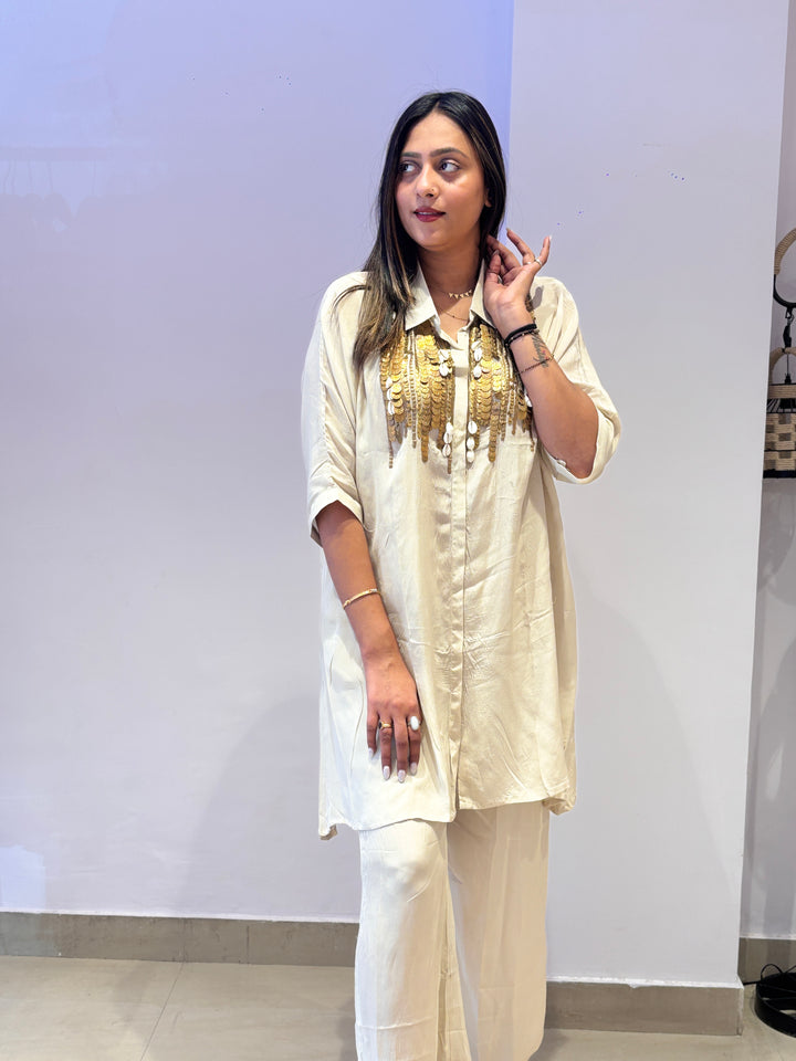 Elegant ivory kurta set with statement golden sequin embellishments on the front. Paired with matching pants, this outfit is ideal for festive celebrations and evening gatherings.
