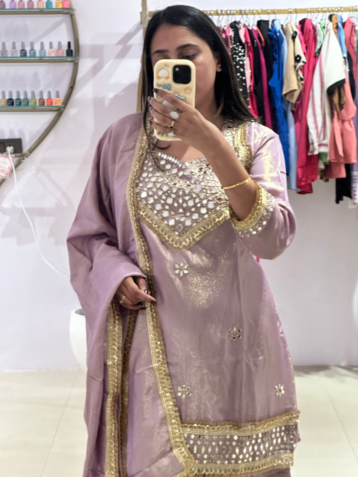 A graceful lavender ethnic ensemble featuring intricate mirror work and zari embroidery on a soft, lustrous fabric. The set comes with a straight kurta, flared sharara bottoms, and a matching dupatta edged with golden lace. Perfect for festive occasions, weddings, and special celebrations, this outfit blends elegance with comfort.