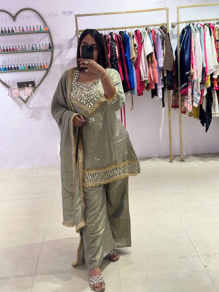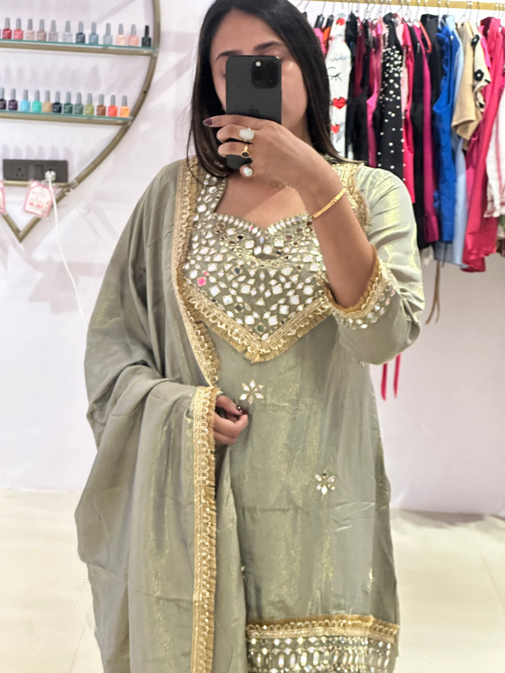 Step into elegance with this pastel grey Anarkali kurta set, adorned with delicate mirror work and intricate golden lace detailing. The shimmering fabric and handcrafted embellishments make it perfect for festive occasions, weddings, or special gatherings. Comes with a matching dupatta for a complete traditional look.