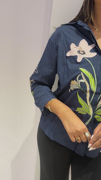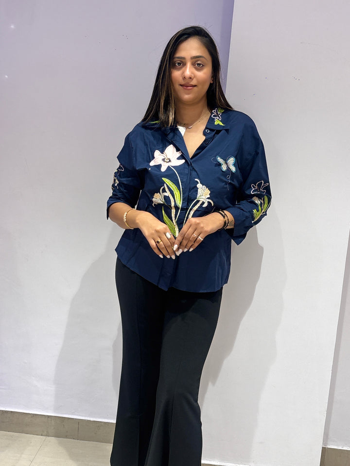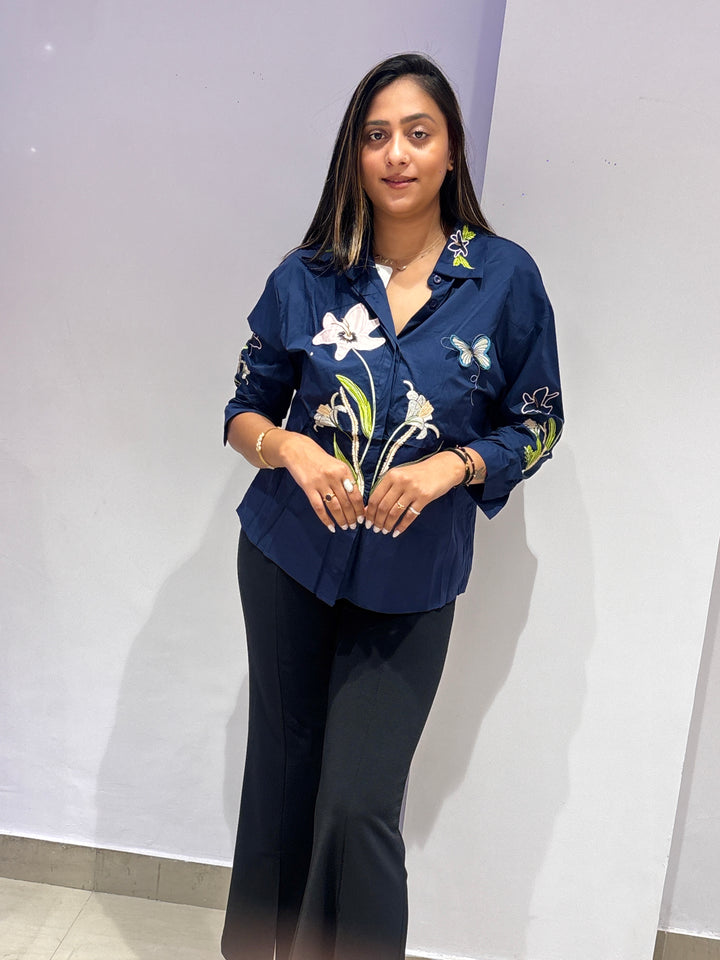 Navy blue shirt top with delicate floral and butterfly embroidery, bringing a touch of elegance to your everyday style.