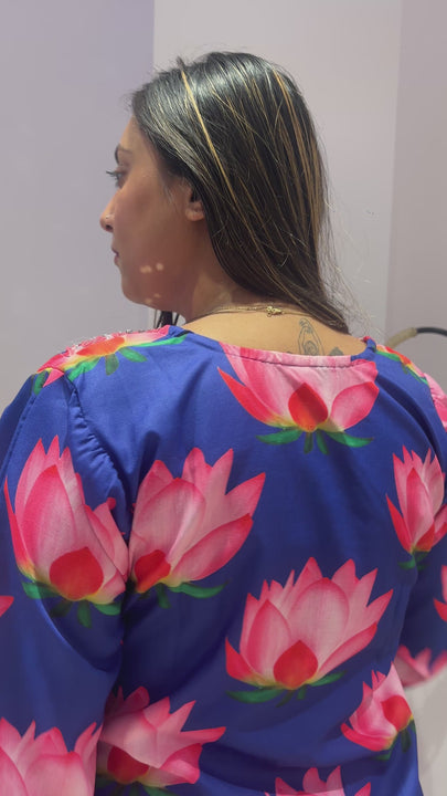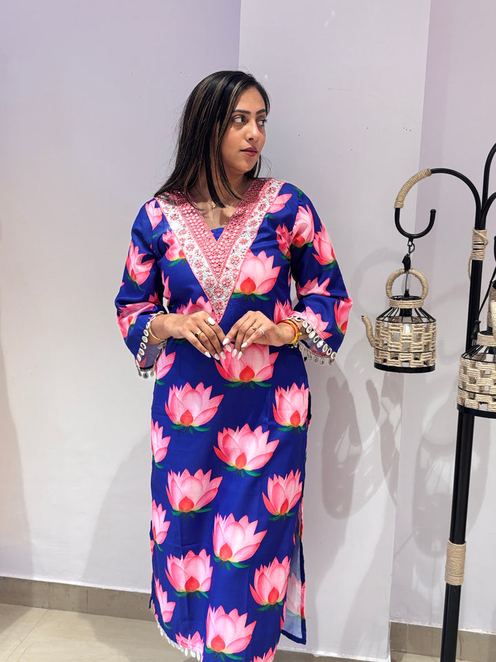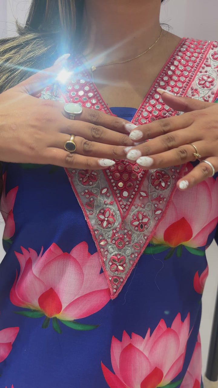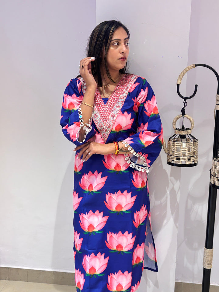Elegant navy blue kurta featuring bold pink lotus floral prints and a beautifully embellished V-neckline. Accented with mirror work and lace details on the sleeves for a chic ethnic look. Perfect for festive gatherings, casual occasions, and everyday elegance.