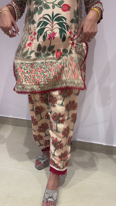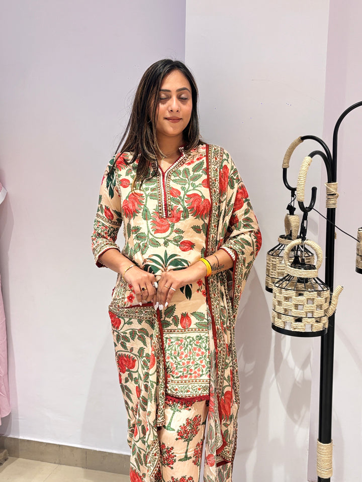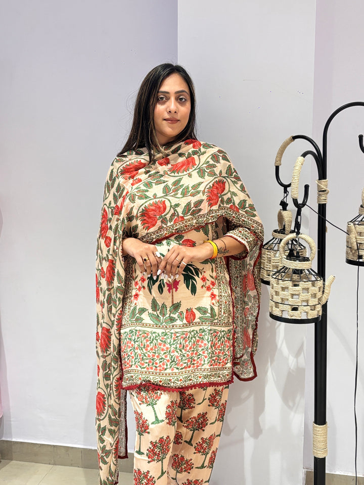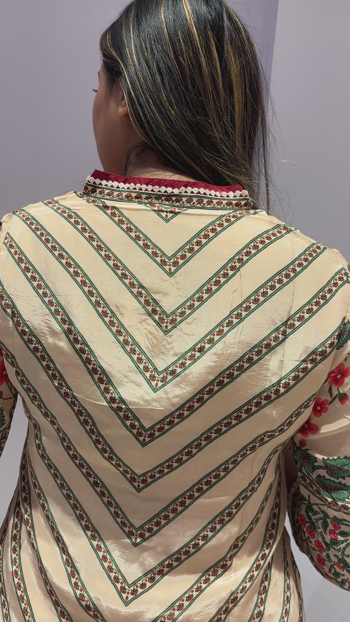 Elegant olive green kurta set featuring mirror and bead embroidery along the neckline. Made with lightweight shiny fabric for a graceful look, paired with a matching dupatta. Perfect for festive wear, family gatherings, and special occasions.