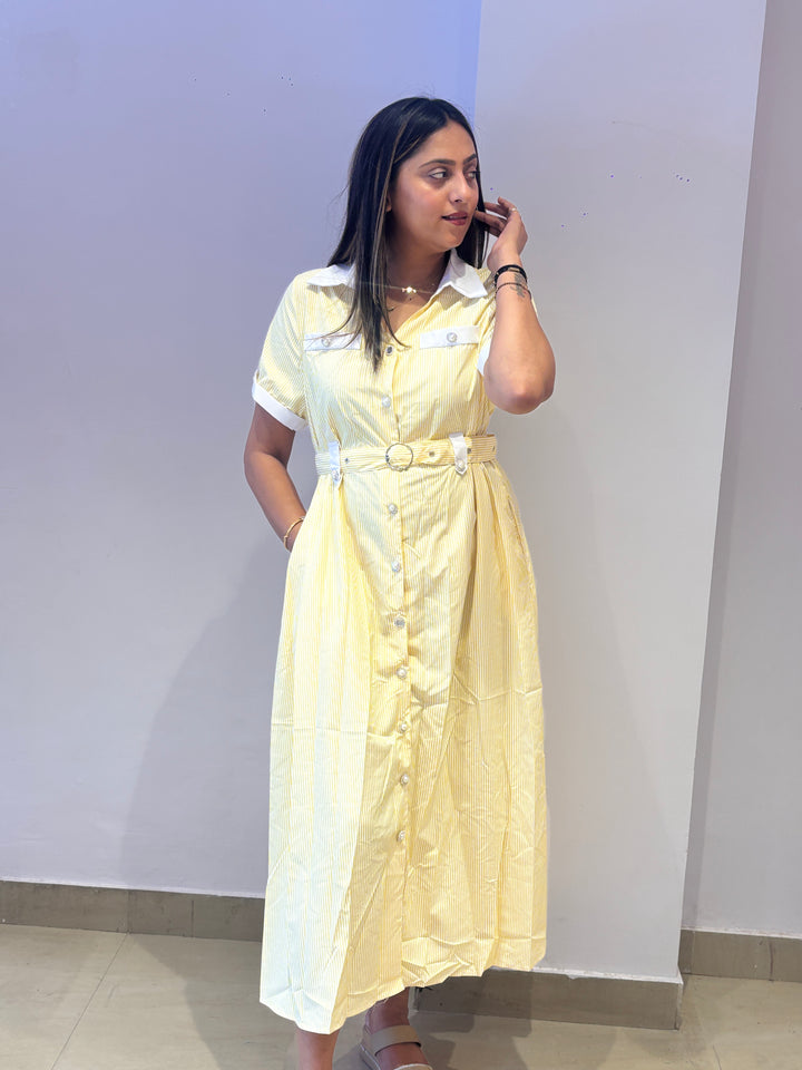 A breezy yellow maxi dress with a shirt-style collar, button-down front, and a belted waist for a chic, everyday look. Perfect for brunches, casual outings, and summer days