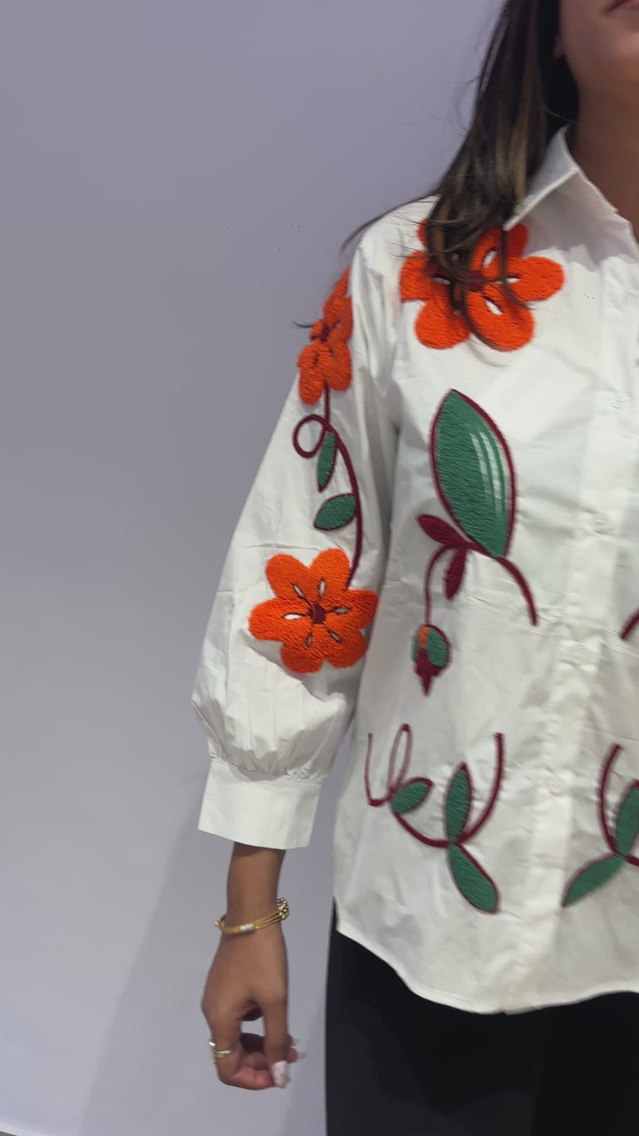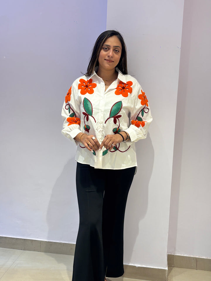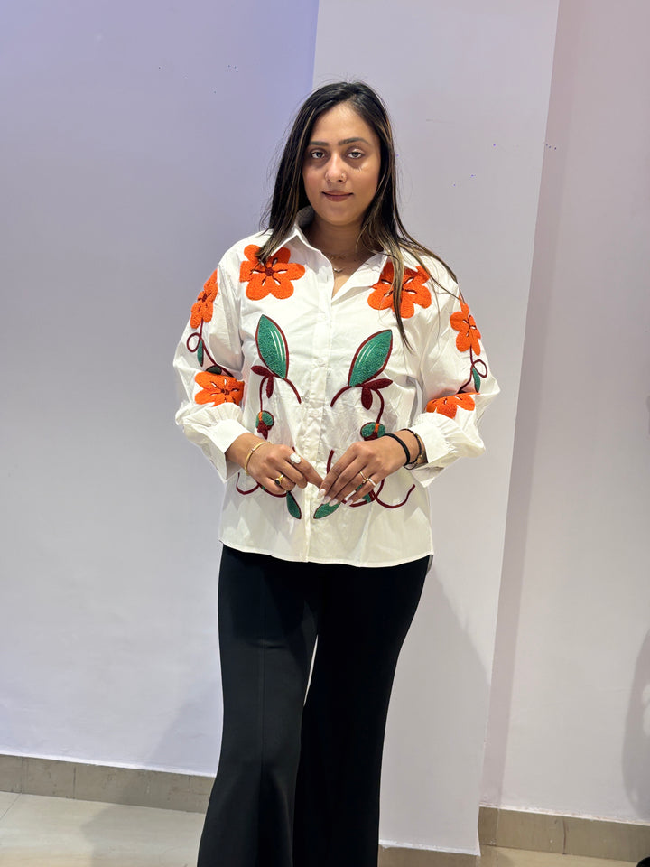White shirt top with bold orange floral embroidery and leafy patterns on the front and sleeves. A statement piece that blends elegance with vibrance